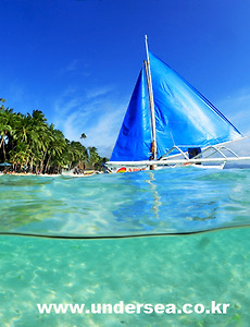 White beach, Boracay, Philippines 다이빙을 마치고 화이트 비치에서 반수면 사진 촬영하였습니다, 멋진 돗을 단 방카와 그 옆에 비키니 차림의 여인을 앵글에 담았습니다, 좀 먼 감이 없진 않지만,,,,,